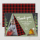 Camping tent with photo flat card thank you. Adorable green camping tent with watercolor trees and campfire under a chalkboard style night sky. Red and black buffalo plaid accents. Change text as preferred.