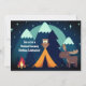 This Camping birthday party invitation features a tent, campfire, an owl and moose all under a stary sky with a full moon and mountains in the background. *