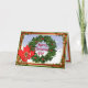 Festive holiday greetings from Canada and Canadians. Pretty gold and red border has holly scroll corners. Snow covered background with holly wreath and Canadian beaver waving flag in front of red mapleleaf. Text says, Merry Christmas Eh! Customise inside greeting, message and closing areas.
