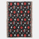 Throw blanket featuring a maple leaf and curling rock pattern in red, white and grey on black background. Perfect for curlers and curling fans.