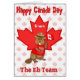 Fun Canadian design features a wavy red waves and Maple leaf background. Cute beaver in a Mountie Hat is waving a Canadian Flag. Text says... Happy Canada Day from The Eh Team on the front. Inside text is ready for you to customise.