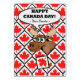 A funny moose breaks through a wall of maple leaf tiles on the cover of this Canada Day greeting card. Happy Canada Day! Dear Cousin, text on the cover. Bold contemporary design in red, white, black, and browns. Art, image, and verse copyright Shoaff Ballanger Studios.
