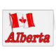 Big red letters spell out the Province name Alberta, with a wavy Canadian flag flying behind it. This design is available on a large assortment of t-shirts, gifts and other apparel.