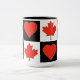 A fun two-tone Canada coffee mug for proud Canadian people. With the a unique chequered heart pattern inspired by the national flag of Canada. Makes a fun gift idea for Canadian friends and family, and anybody who loves Canada.