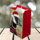 Medium size Christmas holiday gift bag with red trim that features the whimsical photo image of a Canada Goose wearing a red Santa hat and holly berry necklace. Select your gift bag style. A fun, animal design for the holidays!