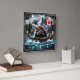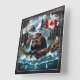 A Canadian beaver sits on a branch in a vibrant lake, surrounded by mountains and trees, with the Canadian flag waving in the background.