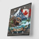 A beaver builds a dam amidst a river with a Canadian flag backdrop, surrounded by mountains and fish, showcasing its natural habitat and activity.