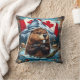 A Canadian beaver holds a branch in water, with a backdrop of mountains and a waving Canadian flag, symbolising Canadian wildlife and culture.