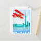 This unique retro design features a biplane in flight with the city of Toronto in the background. The plane is comprised of solid colors which gives it a very graphic look. The city behind the airplane is also simplified which gives the pattern a vintage poster look. A reflection of the city skyscrapers, CN tower and Skydome appear in the water at the base of the design while rays of light shine in all directions in the sky.