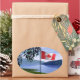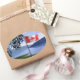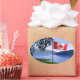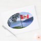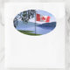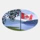 A 3d Canadian scene of a lake and green hills with a maple tree and the Canadian flag.