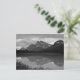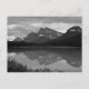A Canadian lake reflects the mountains and scenery, in black and white.