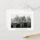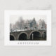 Photo postcard of a canal with a bridge, traditional houses and bikes under some snow in winter in the Dutch capital city, Amsterdam, the Netherlands with a white border and the text 'Amsterdam'.