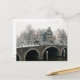 Photo postcard of a canal with a bridge, traditional houses and bikes under some snow in winter in the Dutch capital city, Amsterdam, the Netherlands.