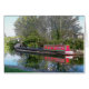The bright red of a narrow boat ireflects in the still water of the canal in an idyllic scene of the english countryside
