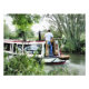 An art design of a man steering his narrowboat along the canal. Canal boats, known in the UK as narrowboats, were originally used to transport goods around the country. They are now used mainly for leisure and attract people from all over the world to enjoy our rural countryside. These boats look very pretty with their brightly coloured cabins, traditionally blue, red or green. Flowers and castle designs also adorn the more traditional boats.