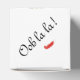 Square classic style favour box with an image, on the front and back, of a black wire corset, a dress form with a red cancan costume with a black feathered bustle, a black beaded necklace, a pair of black cancan boots, a red feathered boa, and a portion of a wall clock. The sides have an image of the Eiffel Tower and “Ooh la la!” is printed in black French script on the top. See the entire Cancan Favour Box collection in the PARTY FAVORS section.