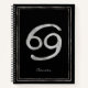 Stylised hammered silver Cancer the crab astrology zodiac birthday symbol in a hand drawn silver fine double line frame. A hardcover or softcover notebook with your choice of inside pages. Choose from sketchbook, bullet journal, checklist, graph paper, recipe book, or lines in various widths and colours. Customisable. Aquarius text in a fine script on the front cover can be personalised, text can also be added on the back.