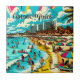Pop art comic book style art scene of a beach with a vintage vibes. AI Art depicts people having fun on the beach shoreline with hotels and and apartments buildings in the background, pretty palm trees, colourful umbrellas and a gorgeous blue cloudy sky in Cancun, Mexico.