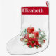 Christmas stocking personalised with a name. Designed with a pretty bouquet made with watercolors. Red candles with gold accents and a smaller white candle too. Surrounded by a pine bouquet with a poinsettia flower.