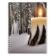 A candle situated in the snow. The candle, likely, appears to be made of a tree trunk and provides a warm light against the cold winter backdrop. The snowy setting adds to the serene and tranquil atmosphere of the scene.