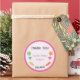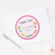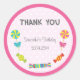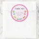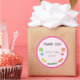 Round sticker for birthday favour with candies theme and pink polkadot background.