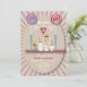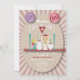 A birthday party invitation featuring an illustration of a candy buffet. Illustration includes lollipops with bunting in between, gumballs, stick candy, and rock candy. Oval and sunburst background. Personalise the text.