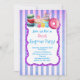 Set on a distressed shabby style pinkish purple striped background. A fancy frane with a purple border with white polka dots adds whimsy to this invite. A collection of candy sits at the top including cupcakes, doughnut, macarons and brightly coloured round candies. Personalise with all your own party details.