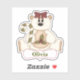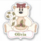 This contour sticker features an image of a white polar teddy bear decorated with a polkadot Christmas bow and a holly and berry image on his tummy. He is holding a green and white striped candy cane. Below him is a red bordered name banner with your child's name in holiday green. *Design credit to Real Deal Clip Art.