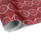 This wrapping paper for the Christmas holiday season has a pattern of red bicycles with red and white candy cane stripes on the frame. The background is dark maroon red. Great for gifts for your cycling friends.