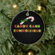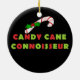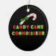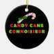 A striped candy cane and red and green holiday text that reads "Candy Cane Connoisseur" on keepsake ornaments perfect for anyone who loves candy canes!