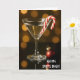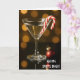 A martini drink with a candy cane sits on a reflective surface, alongside a red Christmas ornament, as soft, warm bokeh lights create a festive ambiance.