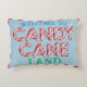 This colourful and festive accent pillow features a whimsical Christmas theme. The phrase "Welcome to Candy Cane Land" is printed across the centre, with "Candy Cane" printed in a red and white striped peppermint pattern. The background is a soft blue, with falling snowflakes.