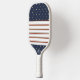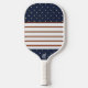A basic striped pattern with a polka dot accents. This Pickleball Paddle features a bold red line with thinner green line, on either side. This combination alternates with a hairline black rule and a thick white band. At the top and bottom of this design there's a block of navy, with gold coloured dots.