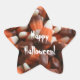 Halloween themed sticker featuring a close up photo of candy corn and Happy Halloween wishes.