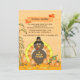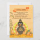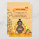 A cute invitation showing a turkey who has candy corn instead of feathers. The turkey wears a pilgrim's hat and is surrounded with pumpkins, corn stalks, fall leaves and candy corn.