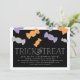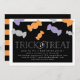 Invite guests to your spooktacular bash with our fun and festive Halloween party invitations in spooky orange, black and purple with a thick white border. A rain of tasty wrapped Halloween candy tops "trick or treat" and your party details in modern white typography. Cards reverse to horizontal black and orange stripes.