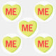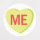 A lime green candy heart that says, "ME."