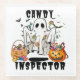 This image is a Halloween-themed design featuring a ghost in the centre, with the words "CANDY INSPECTOR" written in bold black letters below. The ghost is depicted with a friendly, cartoonish expression and is surrounded by various candy-themed elements, including lollipops, candy canes, and candy corn. On either side of the ghost are two jack-o-lanterns, each with a different expression. The jack-o-lanterns are filled with colourful candy, adding to the festive and playful atmosphere of the design. The background is transparent. Overall, the image is a whimsical and cheerful representation of the Halloween holiday, with a focus on the sweet treats that are often associated with the occasion.