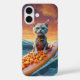 Quirky Halloween design of a skeleton cat riding a wave made of candy corn. Fun, colourful, and perfect for spooky season fans.