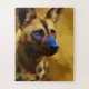 A digital painting that merges hyper-realism with bold, contemporary abstraction. This captivating portrait of a African Wild Dog showcases a harmonious clash of vibrant hues deep blues, golden ochres, and electric greens that breathe life into every fur strand and shadow. The textured, almost cubist brushstrokes add depth and movement, transforming a simple canine profile into a statement of raw beauty and emotional intensity.