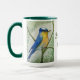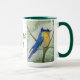 Caneca com ilustração de pássaro azul e amarelo pintado à mão em aquarela.