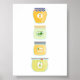 This mixed jams poster has a several typical canning food jar filled with six different types of jams in a simple graphic style with a fruit jams labels in several yellow and green colours. See the collection to mix and match this mixed jams print with other canned food prints. You can make the Pineapple Jam print larger or smaller or transfer to other wall products.