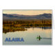 Alone in the wilderness. A canoe plies the mirror-still water of lake in the interior of Alaska. In the distance typical taiga and mountains. Text reading "Alaska" also appears. This image is derived from a United States Fish and Wildlife Service photograph.