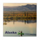 Alone in the wilderness. A canoe plies the mirror-still water of lake in the interior of Alaska. In the distance typical taiga and mountains. Text reading "Alaska" also appears. This image is derived from a United States Fish and Wildlife Service photograph.