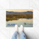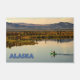 Alone in the wilderness. A canoe plies the mirror-still water of lake in the interior of Alaska.  In the distance typical taiga and mountains. Text reading "Alaska" also appears. This image is derived from a United States Fish and Wildlife Service photograph.