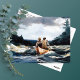 A fine art postcard with the watercolor painting by the American artist Winslow Homer (1836-1910), Canoe in Rapids (1897). A landscape of two men
