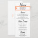 Personalised Menu options on front in black text against crisp white background. The Bride and Groom's Names and Wedding Date are highlighted in pretty cantaloupe colour frame. Backside has simple Monogram initials in cantaloupe text. Original Designs © TamiraZDesigns.