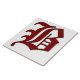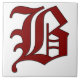 The letter B in Canterbury style done in red on a white background with a slight shadow to give it a three dimensional effect.