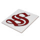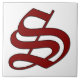 The letter S in Canterbury style done in red on a white background with a slight shadow to give it a three dimensional effect.