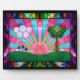 A digital stained-glass design in the Art Deco style popular in the 20th century. The widely-used sunburst motif is central, rising behind a green landscape balanced by a tree on one side and clouds and flowers on the other. Geometric shapes are used to emphasize the symmetry of the scene, with both the tree and clouds made of overlapping circles. Various brightly coloured fractals give the "glass" texture and interest. The scene is framed in black ironwork and diamond-shaped blocks frosted with dark but vivid fractal patterns.